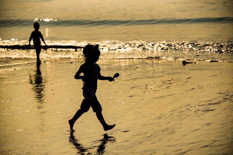 东山岛马銮湾日出,小孩在沙滩玩耍