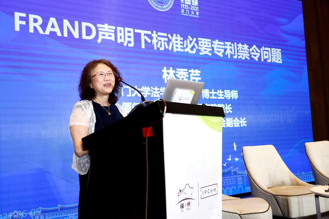 厦门大学知识产权研究院院长林秀芹的演讲主题是“FRAND声明下标准必要专利禁令问题”。林院长从标准制定组织(SSO)对禁令救济的一般态度、美国《政策声明》关于SEP禁令救济态度的重大转变、FRAND声明下禁令救济的原则、FRAND声明下禁令救济的考量因素等方面对美国和欧洲的禁令规定进行了系统介绍,并对我国法院在颁发禁令的标准方面提出了降低禁令办法门槛的中肯建议。