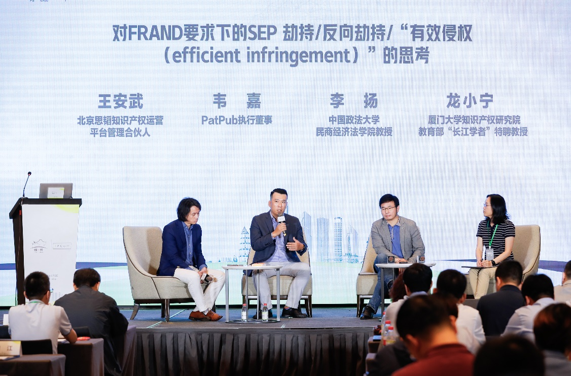 第一场圆桌讨论的主题是“FRAND要求下的SEP劫持/反劫持/有效侵权(efficient infringement)的思考”,由思韬专利运营平台的王安武先生担任主持。圆桌讨论期间,PatPub的韦嘉先生、中国政法大学的李扬教授和厦门大学的龙小宁教授分别就FRAND要求在标准必要专利许可中的具体内涵、有效侵权的产生原因、SEP劫持和反劫持的含义、现状和解决方案等热点问题进行了热烈讨论。