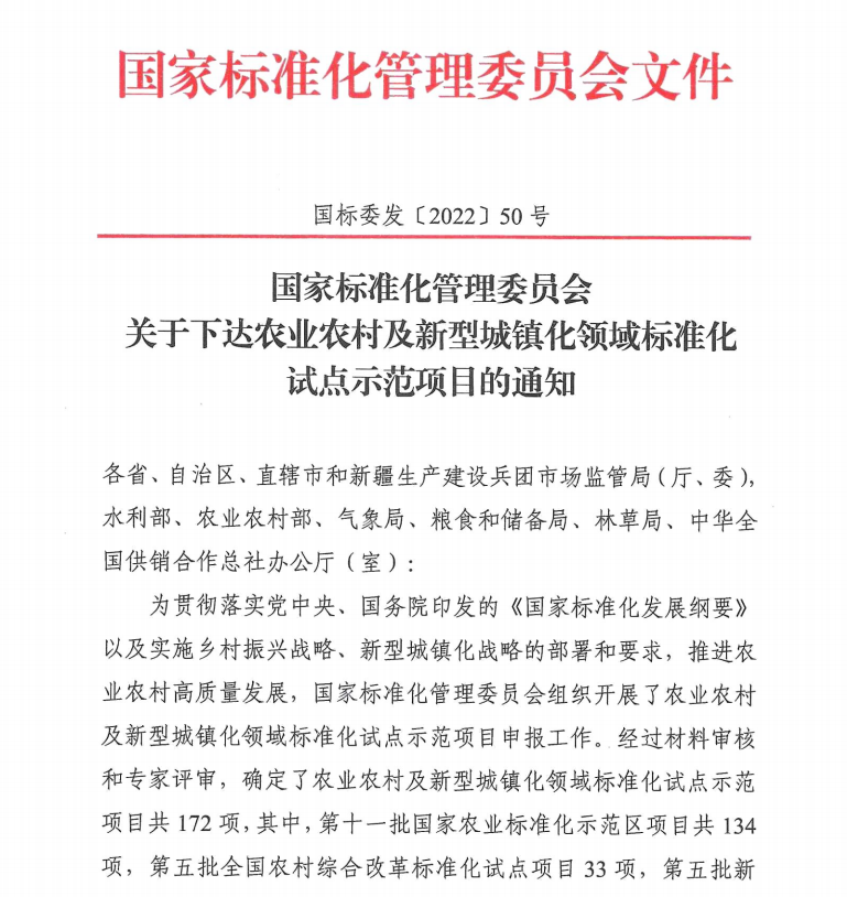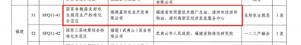 日前,国家标准化管理委员会发布了《关于下达农业农村及新型城镇化领域标准化试点示范项目的通知》(国标委发〔2022〕50号),漳州市市场监督管理局指导推荐的福建嘉田农业开发有限公司获批承担“国家杏鲍菇良好农业规范生产标准化示范区”建设,长泰区农业农村局获批参与“数字乡村建设”试点。