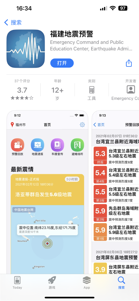 “福建地震预警”客户端下载页。来源:应用商店 “双端”覆盖线上线下 实现“科普+预警” 2018年,由福建省地震局自主研发的“福建地震预警”客户端正式上线,利用高效可靠的消息传递机制,实时接收福建省地震局推送的闽台地区地震预警和全球地震速报信息,同时还提供地震科普和避难场所查询等功能,目前可在福建省地震局官网和各大移动端应用商店下载。 在省内各大公共场所,特别是中小学校,福建省已布设了1.8万余台地震预警信息发布终端,利用电子屏与显示灯告知地震相关信息。“终端上有4种颜色的显示灯,红橙黄蓝四色表示不同的地震强度和危害程度,更加直观醒目。”李军解释。 “根据当前的定位,客户端与终端不仅能够告知地震信息,还能够预估破坏程度,以便及时采取必要的措施。”李军介绍,“在没有地震发生的时候,我们利用客户端和终端对地震知识进行科普宣传。”此外,省地震局未来还将进一步开放数据接口,为更多的人提供地震预警和科普服务。