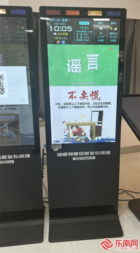 地震预警信息发布终端。东南网记者 周霞 摄 就地避险最重要 谨防二次伤害 地震发生持续时间往往较短,因此避险必须及时果断、因地制宜。最佳避险方法是远离建筑物,逃生至空旷开阔的广场、公园等场所,俯身保护头部。“如果没来得及跑,一定要保持稳定的情绪,观察周边情形,藏身到坚硬牢固的区域,比如桌下、床下,立刻蹲下并用手或枕头遮挡头部,以防伤害。”李军提示,在地震波结束后,要立即观察周边环境,在确保安全的情况下立即逃生,尽量不要返回室内。 如不幸被掩埋在地震废墟中,应保存体力,勿大声喊叫,可以利用敲击制造响声来引起救援人员的注意。“有条件时,要尽量加固或扩展自己被困的区域,以防余震对自己造成二次伤害。”李军建议。