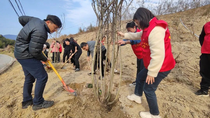 活动中,大家分工合作,搬树运苗、抡锄挖坑、扶树掩土、执桶浇水,每个环节衔接有序,配合默契,呈现一片“志愿红、春意浓”的繁忙景象。经过几个小时的努力,300余棵映山红“安家落户”。