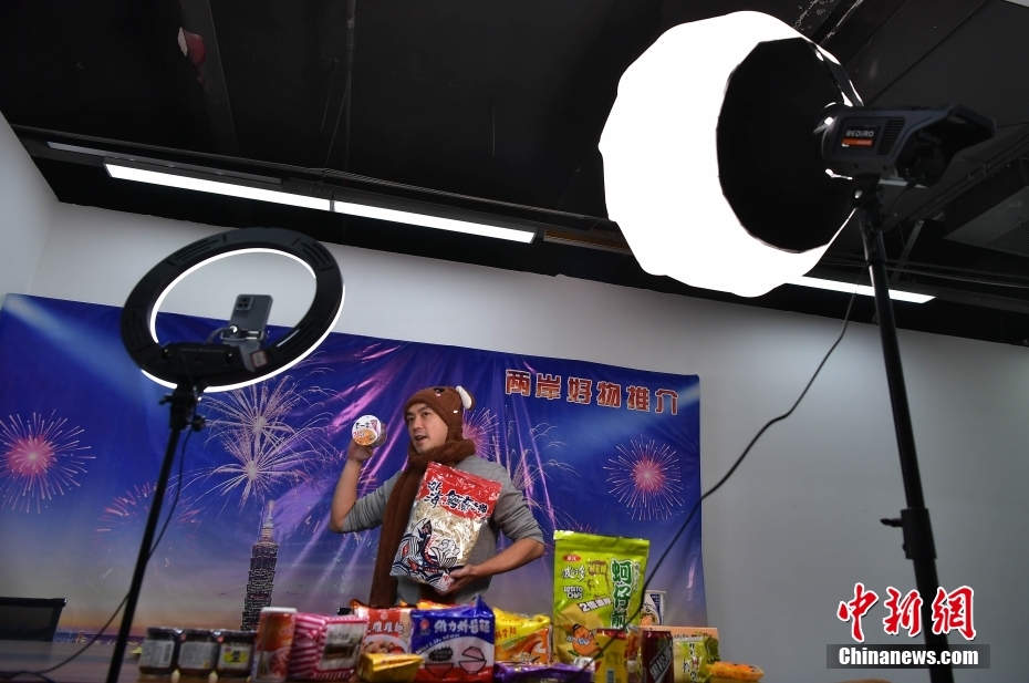 3月7日,在位于福建福州的中亭数字产业中心的一家台湾电商直播间,台胞吴升桦直播销售来自台湾的商品。