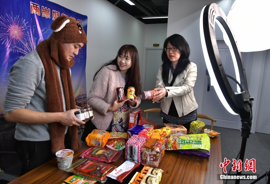 3月7日,在位于福建福州的中亭数字产业中心的一家台湾电商直播间,台胞吴升桦(左)和台胞陈筱婷(中)、台胞许真真(右)准备直播销售的台湾商品。五年前,看到大陆的电商发展机遇,吴升桦开始经营网络直播业务。在福州创业生活的十多年里,他切身感受到了大陆对台胞台企发展的支持和关爱。