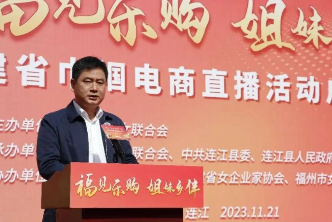 陈成开现场致辞 颜财斌 摄 陈成开代表连江县委、县政府向前来参与活动的女企业家代表、巾帼电商带货能手、参展企业等表示欢迎。他表示,巾帼网络直播活动不仅打开农特产品销售渠道、解决农户燃眉之急,更帮助了女企业家、女性创业者转变经营模式、实现转型发展。希望连江县妇联要积极发挥组织优势,引导、鼓励更多的女企业家、农产品经纪人参与并顺应数字化新经济业态,掌握数字“新工具”,成为当地经济产业发展的带头人,带动更多的妇女同胞创业创新和就业增收,推动实现农村更富裕、生活更幸福、乡村更美丽。