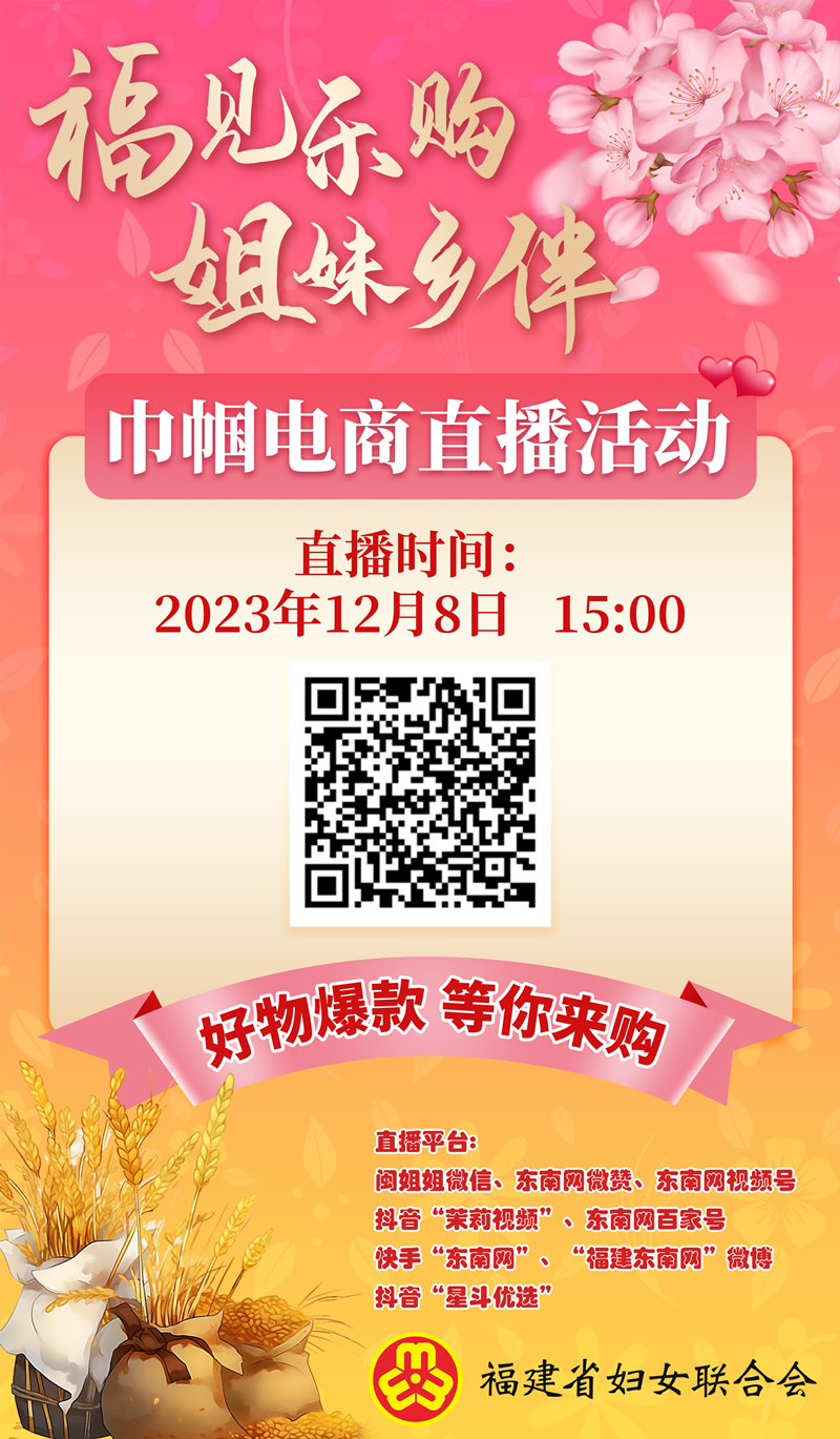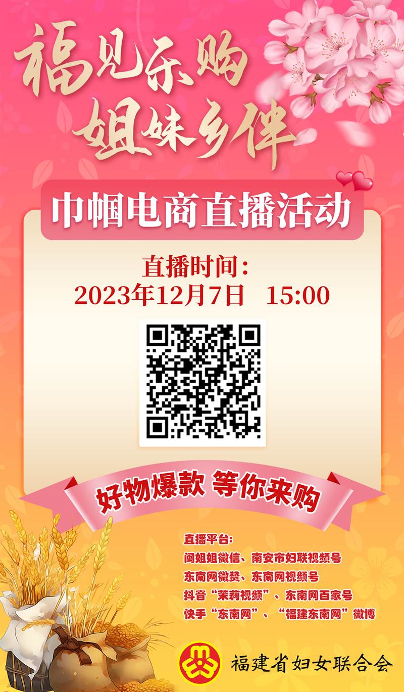 12月7日至8日,福建省巾帼电商直播活动将走进泉州南安、泉州鲤城。届时,90余件当地“妇”字号企业特色农产品、美食小吃、巾帼电商代表好物及西部地区农特产品将亮相直播间,带您呷好味,寻好礼! 本次活动由福建省妇女联合会主办,泉州市妇联分别联合南安市妇联、南安市女企业家联谊会暨拥军协会和鲤城区妇联、鲤城区女企业家联谊会协办。12月7日,东南网将携手南安市北空间众创业化器有限公司 (南安北部电商创业园)举办泉州首场巾帼电商直播活动,展示红葱酥、咸茶、麻糍等特色地方食品及当地巾帼女企好物;12月8日,东南网还将携手位于泉州鲤城的福建省星斗数字科技有限公司举办巾帼电商直播活动,带来糕点礼盒、进口商品等优质伴手礼。直播期间,两地女企业家代表、巾帼新农人、巾帼电商直播代表人物等将做客直播间,为大家倾情推荐当地代表商品,让您足不出户,尽享缤纷好物。一大批好物将以优惠折扣上架直播间,超值福利等你来抢!不容错过! 2023年“福见乐购 姐妹乡伴”巾帼电商直播活动于11月21日在福州连江启动。活动以“基地 直播 故事”的推广模式,举办15场直播,覆盖我省9个设区市和平潭综合实验区,围绕巾帼优品推广,引入当地乡村女主播,助力巾帼优品带货,持续帮助宁夏、新疆、西藏、甘肃地区销售巾帼好物,为乡村振兴赋能添翼。 启动仪式当天,80余件巾帼好物亮相福建省妇联巾帼电商直播 · 连江直播间,吸引82.27万网友观看并选购,同期还举办了线下展销活动,受到当地群众欢迎。 福见乐购,姐妹乡伴。识别下方二维码,快进入直播间把巾帼好物带回家吧!