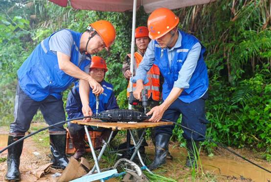 紧急熔接光缆 连续暴雨造成宁德市蕉城、福安、福鼎等地出现河流水位上涨,道路积水严重。针对这一情况,中国电信宁德分公司迅速启动防汛防台风应急指挥调度响应,组织应急抢险人员赶赴受灾前线,第一时间抢修受损通信设施。6月18日,宁德市三都镇三坪村机房被淹,线路受损,影响周边基站运行。为保障地方政府的防汛应急通信畅通无阻,保障人员立即行动,争分夺秒地进行机房抽排水、渗水点封堵、接续基站光缆、线路防护等工作,确保通信设施安全稳定运行。