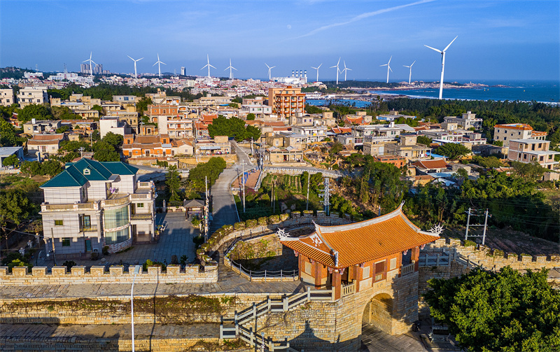摄于泉州晋江市金井镇福全古城。老旧的城与新建的风能发电,印证着新时代的到来。 黄志秉/摄 |