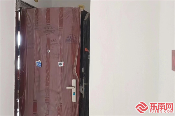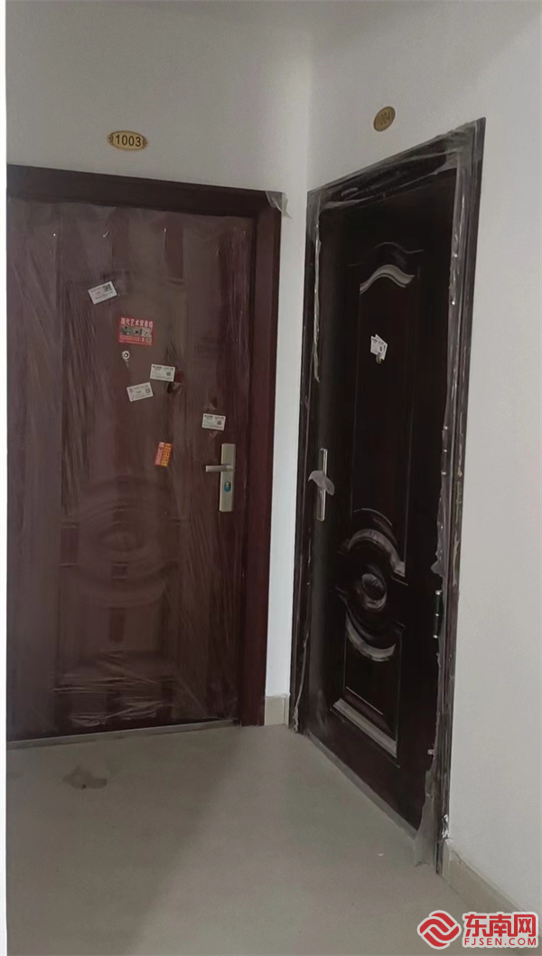 相邻两户开门“打架”。东南网记者 练为泉 摄 3月12日,东南网记者来到宁化县翠江华庭小区。该小区交房不久,已有不少住户开始装修。在小区里行走一圈,发现6、7、8、9栋每层楼均为两梯四户的格局,电梯两侧各两户。同侧两户的入户门紧挨在一起,加上均为外开设计,同时开门确实会发生碰撞。其他几栋楼因户型较大,入户门之间距离较远,便没有开门“打架”的尴尬。