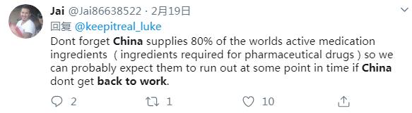 推特用户Jai说:不要忘了中国供应着全世界80%的活性药物成分,因此如果中国不复工复产,它们可能会在某个时间点用完。 响应国内外呼声,中国近日有序推进复工复产,对此海外人士都看在眼里。