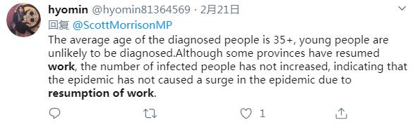 推特用户hyomin说,一些省份已经复工,不过受感染的人数没有随之增加,这表明复工复产没有导致更多感染病例。
