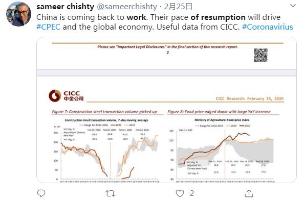 推特用户sameer chishty说:中国正在复工复产。他们的这一步伐将驱动全球经济增长。