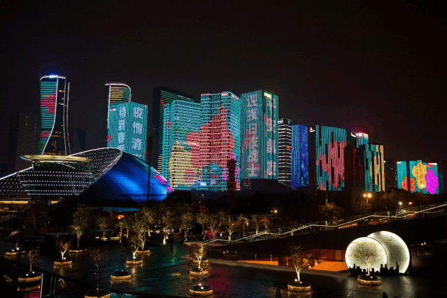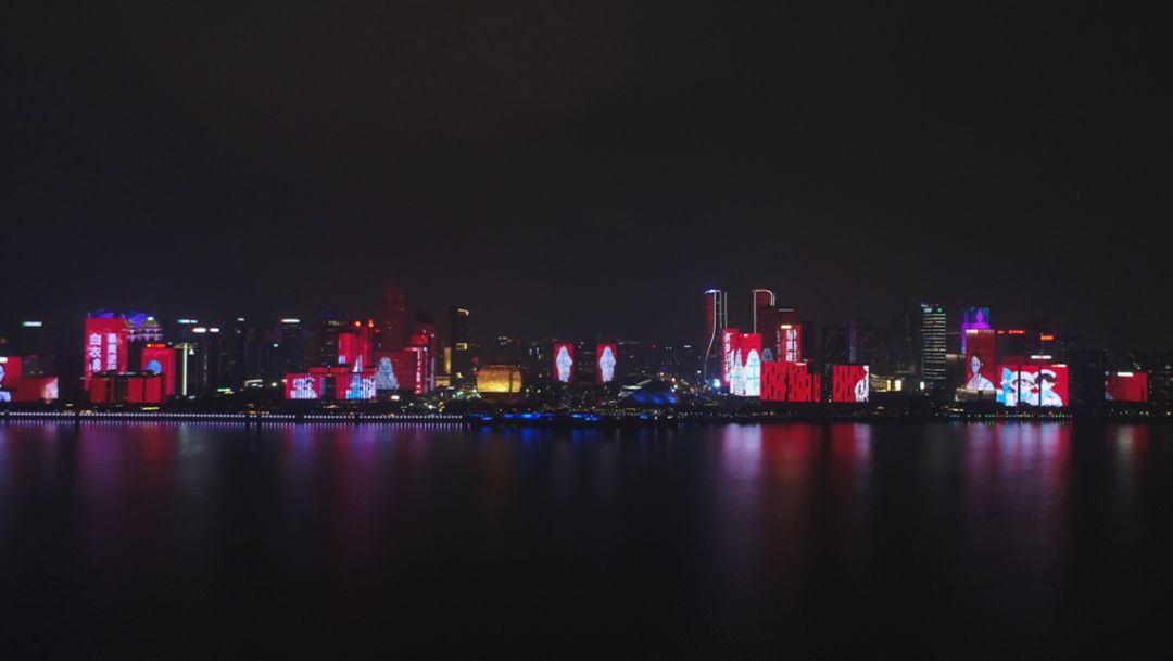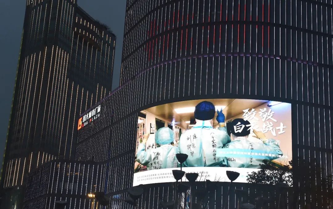 钱塘江两岸 夜幕下,钱塘江畔, 绵延3公里的恢弘巨幕,流光溢彩、璀璨夺目。 钱塘江两岸媒体墙滚动播放着 致敬白衣战士:“敬佑生命、救死扶伤 甘于奉献、大爱无疆” “待到春暖开花疫情消灭时, 迎接白衣战士平安凯旋 ” “白衣战士——最美逆行者” 同样吸引着城市人的目光。