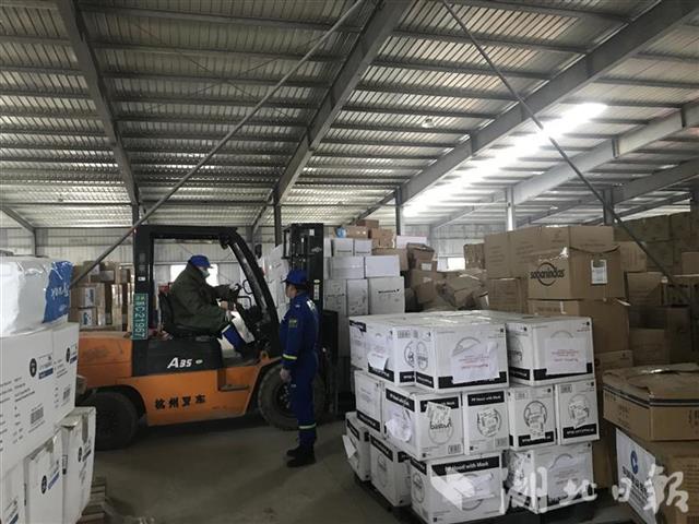 24小时连轴转,450人轮流接力 每天72万件物资发往防疫最前线 进入基地,记者仿佛来到了一家正在加班作业的工厂:等候进入的车辆排起了长队;从门岗到仓库约300米的道路两边,摆放着一排集装箱,里面阵阵电话声、传真声;在仓库门口,工作人员正指挥着2辆货车有序进入…… 仓库内更是热火朝天,有人开着叉车,有人推着平板车,还有人赤手上阵,把一件件摆得整整齐齐的纸箱搬装上大货车。5名队员拿着笔和纸,记录每一件出库物品。