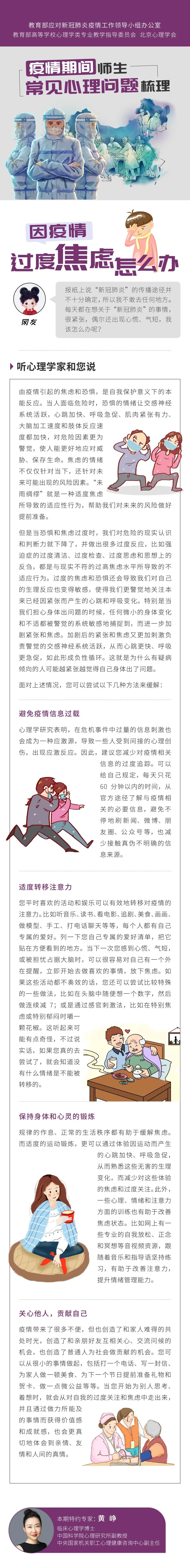2020-03-05 21:49:39 来源:微言教育 责任编辑:李雅兰 作者:疫情当下,关于心理方面你有什么想问的问题吗?欢迎大家拨打教育部华中师范大学心理援助热线:4009678920、010-67440033、027-59427263,或微信留言,我们将邀请专家为你解答! 今天,推出《用“心”战“疫”》第㉓期,随教育小微一起来听中山大学特聘副研究员曾光、中科院心理研究所副教授黄峥详解,疫情期间师生常见心理问题如何调整↓↓↓