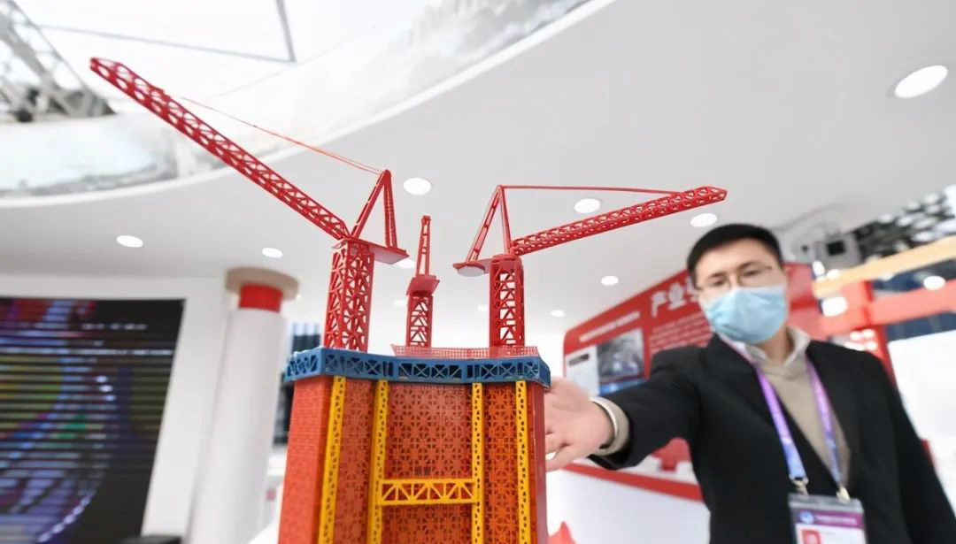 △第三届进博会上展出的“空中造楼机”不仅较传统施工装备更加安全智能,还可缩短20%的工期。