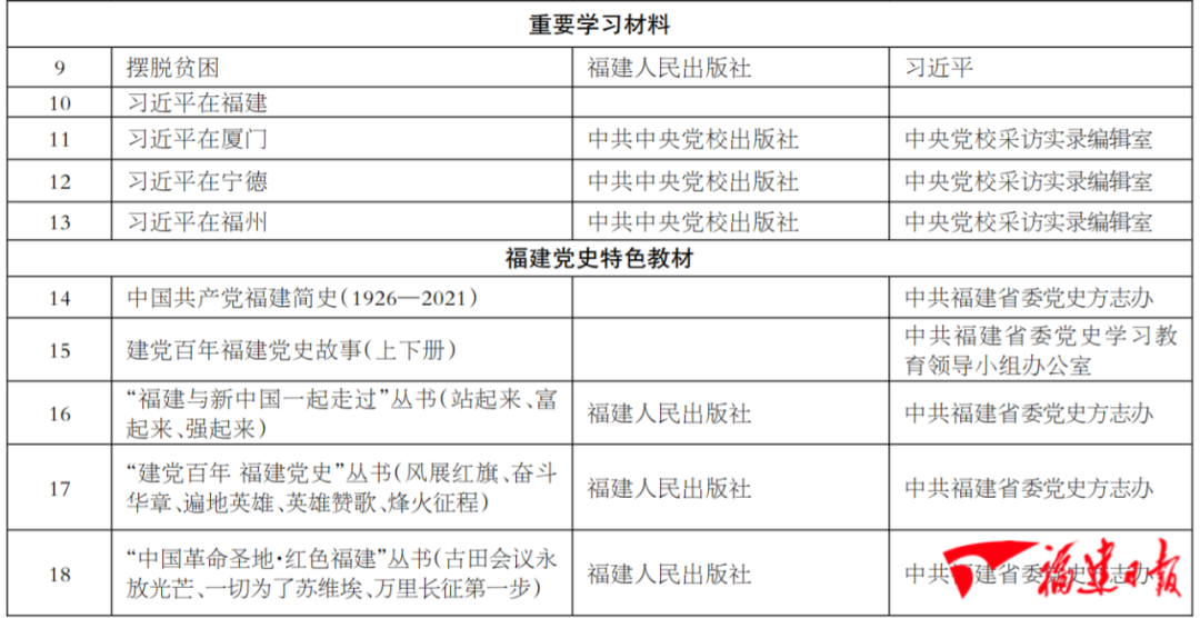 为扎实推进我省党史学习教育深入开展,日前,省委党史学习教育领导小组办公室发布党史学习教育推荐书目,包括指定学习材料、重要参考材料、重要学习材料、福建党史特色教材等四类18种图书,供广大党员干部学习使用。 省委党史学习教育领导小组办公室要求,广大党员干部要坚持读原著、学原文、悟原理,通过理论学习中心组学习、“三会一课”、学习分享会等形式,深入研读指定学习材料,用好重要参考材料,推动广大党员干部牢固树立唯物史观,强化理论思维、历史思维,深入理解把握马克思主义中国化成果特别是习近平新时代中国特色社会主义思想的科学性真理性。坚持学习党史与学习新中国史、改革开放史、社会主义发展史相贯通,与学习中国共产党福建地方史相贯通,把学习党史与总结经验、观照现实、推动工作相贯通,引导党员干部提升党性修养,树立正确的历史观、民族观、国家观、文化观,感悟初心使命,激发奋斗动力,加快全方位推动高质量发展超越,以优异成绩庆祝建党一百周年。 中共福建省委党史学习教育领导小组办公室向党员干部推荐学习书目
