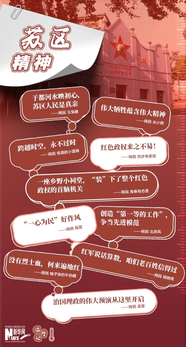“永远向上的精神火焰”系列网评之三: “苏区干部好作风,自带干粮去办公,日着草鞋干革命,夜打灯笼访贫农。”这首至今传唱的山歌,体现了中国共产党人的优良作风和艰苦奋斗精神,表达了当年苏区人民对苏区干部好作风的赞颂之情。 光阴流转,斗转星移,“人民至上”的初心始终不渝。当年苏区如火如荼的革命斗争已成历史记忆,但伟大的苏区精神仍然闪烁着新的时代光芒。社交平台上的网民们关于苏区精神的留言,再次让我们感受到以坚定信念、求真务实、一心为民、清正廉洁、艰苦奋斗、争创一流、无私奉献等为主要内涵的苏区精神的力量。这一精神是无数革命先辈用鲜血和生命铸就的,是我们融入血脉的信仰,有着生生不息的力量。(文字:董璐 海报设计:王晔)