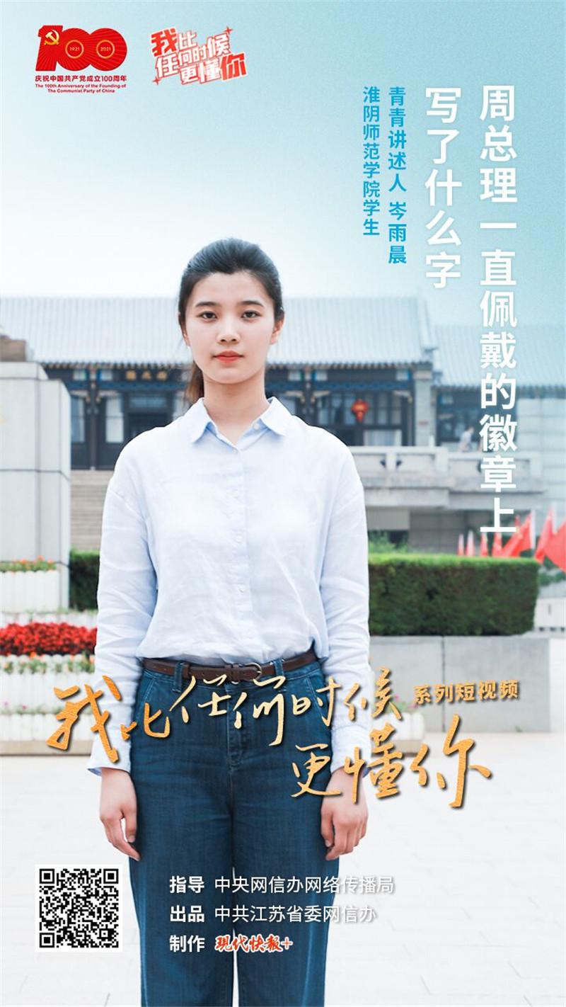 8 月 16 日," 我比任何时候更懂你 " 系列短视频第 23 集《周总理一直佩戴的徽章上写了什么字?》上线。本集青青讲述人是淮阴师范学院学生岑雨晨。 她说,作为一名 00 后,认识和了解周总理,大部分是从影视剧、书本中开始的,而来到位于淮安的周恩来纪念馆,自己对周恩来总理的认识更不一样了。