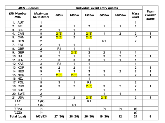 北京冬奥会速度滑冰男子项目席位分配情况。图/国际滑联官网 速度滑冰男子项目分为500米、1000米、1500米、5000米、10000米、集体出发以及团体追逐7个小项,共有103个参赛席位,荷兰速度滑冰男队同样拿满17个席位。除了5000米、10000米两个长距离项目,中国速度滑冰男队拿到其余5个小项的参赛资格,总计8个参赛席位。 据国际滑联介绍,北京冬奥会速度滑冰项目的参赛席位并未最终确定。以中国速度滑冰队为例,在女子500米、5000米以及男子500米、1500米4个小项上,由于顺位靠前,如果有其他队伍的运动员无法参赛,中国运动员仍有机会递补参赛。 此外,国家体育总局冬季运动管理中心今天发布公告,经研究决定,宁忠岩、高亭宇两位中国男子速滑名将已经获得北京冬奥会参赛资格。结合国际滑联公布的参赛席位,其余4名男运动员、8名女运动员将通过中国速度滑冰队的内部选拔产生。 北京冬奥会中国速度滑冰队参赛席位 女子:500米(2个)、1000米(3个)、1500米(3个)、3000米(2个)、5000米(1个)、集体出发(2个)、团体追逐(1个) 男子:500米(2个)、1000米(2个)、1500米(2个)、集体出发(1个)、团体追逐(1个) 新京报记者 徐邦印 |