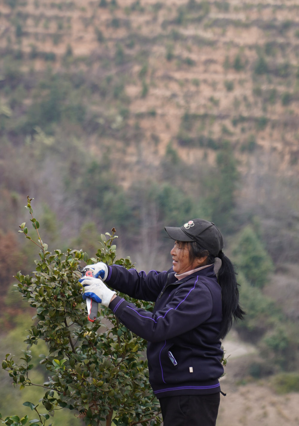 2月24日,在位于江西赣州市经开区湖边镇蛤湖村的白石下油茶基地,农户在修剪植株。新华社记者 周密 摄