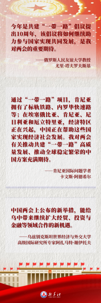 近10年间,秉持共商共建共享原则,高质量共建“一带一路”结出累累硕果,成为当今世界深受欢迎的国际公共产品和国际合作平台。著有《“一带一路”西行漫记》的俄罗斯人民友谊大学教授尤里·塔夫罗夫斯基表示,今年是共建“一带一路”倡议提出10周年,该倡议将如何继续助力参与国家实现共同发展,是他对两会的重要期待。 “通过‘一带一路’项目,肯尼亚拥有了标轨铁路、内罗毕快速路等;在埃塞俄比亚、肯尼亚、尼日利亚和厄立特里亚,经济特区正在兴起,中国正在帮助这些国家实现经济社会发展。”肯尼亚国际问题学者卡文斯·阿德希尔说,他对两会有关推动共建“一带一路”高质量发展、推动全球稳定繁荣的中国方案充满期待。 “乌兹别克斯坦将这一倡议视为通过陆路与海路合作巩固国家间合作的重要途径,而它也正在成为重要的全球经济发展平台。”乌兹别克斯坦世界经济与外交大学高级国际研究所专家阿扎马特·谢伊托夫说,期待“中国两会上公布的新举措,能给乌中带来继续扩大经贸、投资与金融等领域合作的新机遇”。