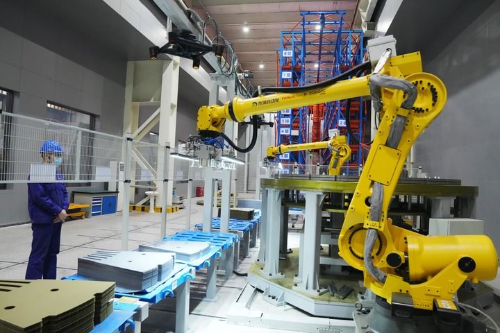 2022年11月17日,在哈电集团哈尔滨电机厂有限责任公司的数字化智能示范车间,工人观察机械臂作业。新华社记者 王建威 摄