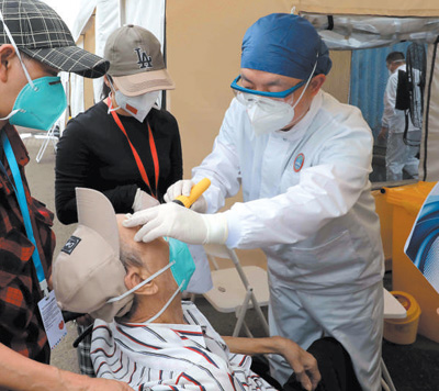 2022年11月11日,在执行“和谐使命—2022”任务中,中国军医在印尼雅加达丹戎不碌港码头医疗服务区对当地患者进行眼科检查。 蒲海洋摄