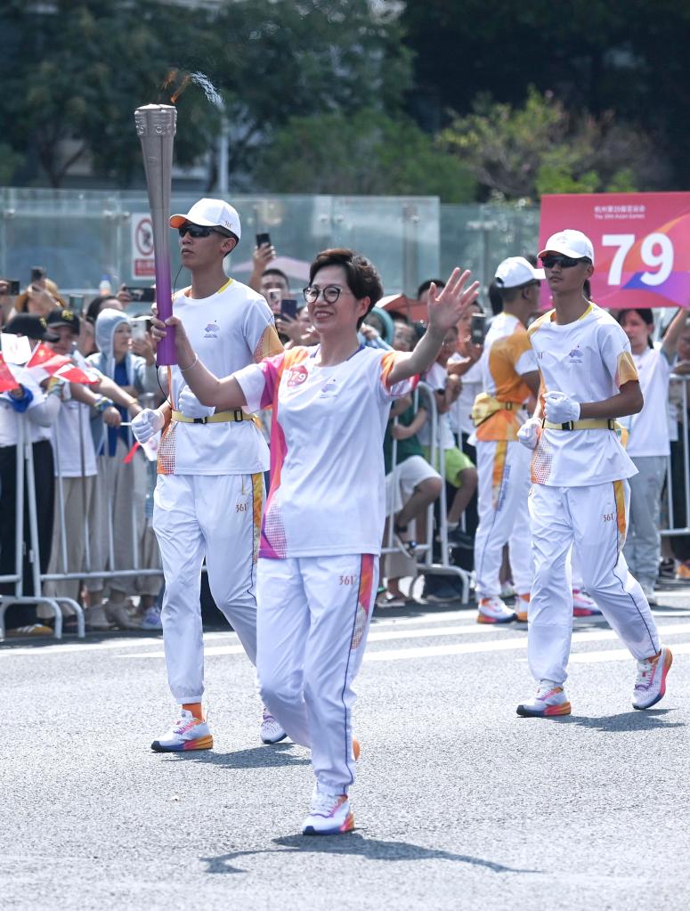 9月11日,火炬手屠红燕在火炬传递中。当日,杭州亚运会火炬在浙江省绍兴传递。新华社记者徐昱 摄