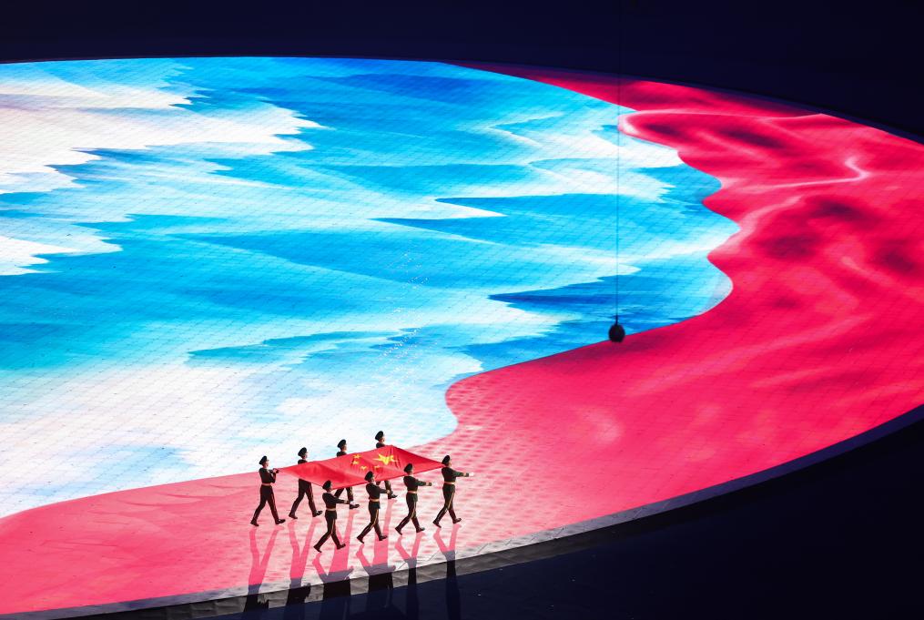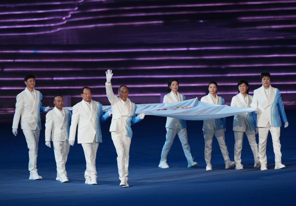 9月23日,中华人民共和国国旗入场。新华社记者 潘昱龙 摄 伴着雄壮的《义勇军进行曲》,五星红旗缓缓升起。 20时09分,地屏上勾勒出团扇造型,“梅兰竹菊”主题之窗开启,不同国家和地区的运动员纷至而来。中国以真挚的热情开门迎客,定格下四海宾朋如约而至的“杭州时刻”。 气势宏大的《歌唱祖国》奏响,包括886名运动员在内的中国体育代表团最后入场,全场一片欢腾,掌声欢呼声此起彼伏。本届亚运会上,中国健儿将参加38个大项、407个小项的角逐。 从1974年在伊朗首都德黑兰首次参加亚运会,到亚运金牌数累计破千,近50年来,中国全社会重视体育、支持体育、参与体育的氛围愈加浓厚。 光阴荏苒,深情如一。 从北京亚运会的热烈澎湃,到广州亚运会的时尚活力,如今的杭州亚运会用酷炫科技表现中华文化,展现出新时代中国自信自强、蓬勃向上的精神风貌。 钱塘之潮焕新亚运活力 伴随习近平主席宣布盛会开幕,“数字焰火”流光溢彩,全场观众齐声高呼,为亚运释放最炽烈的热情。 亚奥理事会全部45个成员齐聚本届亚运赛场,参赛运动员人数超过12000名,创历届之最;比赛项目既有田径、游泳等奥运大项,也有武术、藤球、板球、克柔术等代表亚洲不同地域体育文化的特色项目,还有首次成为亚运会正式项目的霹雳舞等。多元包容,青春洋溢,有着70余年历史的亚洲运动会焕发出全新活力。 “非常高兴亚运会能够把奥运会新项目纳入其中。”前来出席开幕式的国际奥委会主席托马斯·巴赫相信,杭州亚运会将成功精彩,促进亚洲的团结与友谊。 音乐响起,8名中国运动员、教练员代表共执亚奥理事会会旗入场。伴随着亚奥理事会会歌,会旗缓缓上升,在杭州高高飘扬。