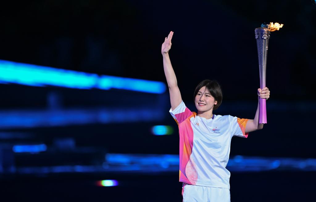 9月23日,火炬手叶诗文在开幕式上进行火炬传递。新华社记者 李一博 摄 早前,杭州亚组委向全球推出“亚运数字火炬手”,采用区块链技术的线上火炬传递活动此后开启。300天时间里,来自全球130多个国家和地区的1亿多人突破时空限制,成为“数字火炬手”,直接参与到亚运盛会中。 夜幕下,“数字火炬手”跨越波澜壮阔的钱塘江,从远方奔赴而来,终于抵达杭州奥体中心体育场上空。 22时整,承载着全亚洲乃至全球民众的热情期盼,“数字火炬手”和最后一棒火炬手汪顺一起,点燃象征亚洲大团结的亚运之火,点亮体育之梦、幸福之梦、亚运之梦。“薪火”相传,主火炬以零碳甲醇作为燃料,在亚运史上首次实现废碳再生。