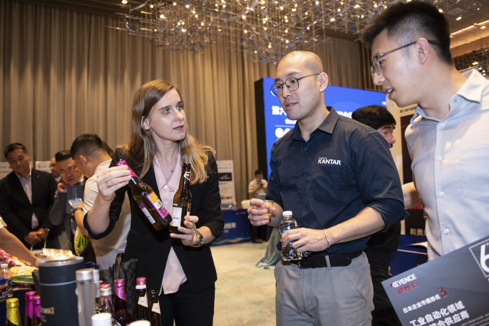 在深圳举行的进博会展前供需对接活动上,波兰投资贸易局的工作人员(左前)向采购商展示风味啤酒(2023年8月29日摄)。新华社记者 毛思倩 摄