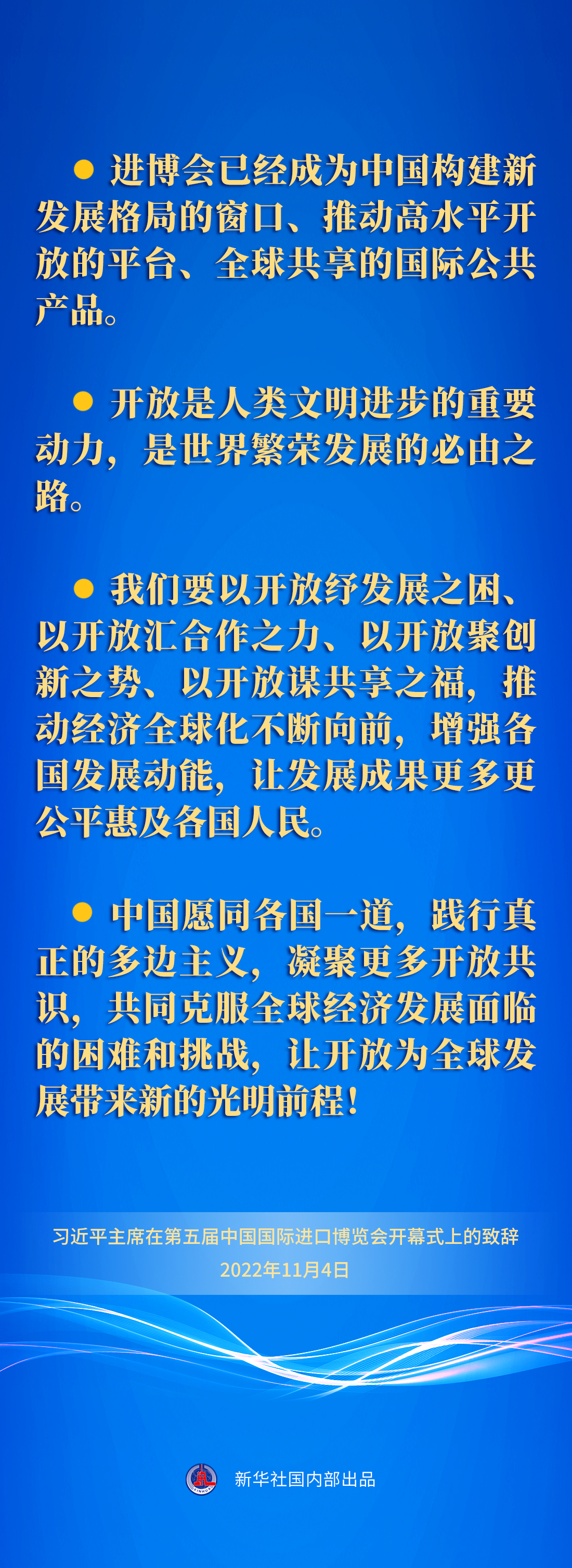 2023-11-05 08:32:40 来源:新华社 责任编辑:陈玮 作者:黄浦江畔,万商云集。形如“四叶草”的国家会展中心(上海)再度张开怀抱,迎接参加第六届进博会的八方宾客。 中国国际进口博览会,是迄今为止世界上第一个以进口为主题的国家级展会,是国际贸易发展史上一大创举。自2018年以来,进博会已连续举办五届,习近平主席共发表五次主旨演讲或致辞,“高水平开放”始终是其中的关键词。 五次重要宣示,传递出中国坚定不移推动高水平开放的坚定决心,同世界共享市场机遇的真诚愿望,为构建开放型世界经济贡献中国力量的不变承诺。
