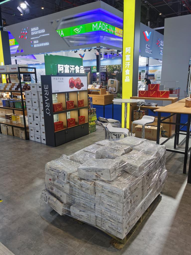 3日一早,阿富汗坎大哈石榴进入展馆,即将在食品展区内的绿地全球食品馆第一次与中国公众见面。(绿地集团供图) 阿里说,坎大哈石榴能顺利亮相第六届进博会,离不开绿地集团在物流运输以及海关协调上的强大助力。石榴从坎大哈果园被采摘后,需经过1天时间由卡车运输至阿富汗首都喀布尔,在喀布尔进行包装、装箱后空运至迪拜,再从迪拜转机至北京,最后到达上海海关。经绿地多方协调,并借助今年进博会新出台的海关便利政策,终于为阿富汗石榴走通了进入第六届进博会的路。 “中国市场让很多阿富汗人看到了希望,中国一次次带给我惊喜。”阿里说。 |