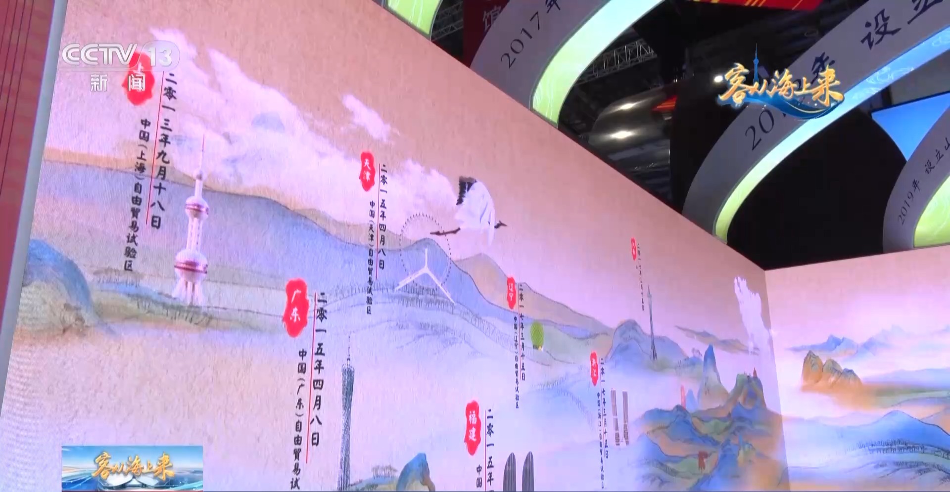 在今年进博会上,中国馆专门设立了“自贸试验区建设十周年成就展”。一条展示自贸试验区建设的时光隧道,现场采用了传统水墨画风格,为您全景呈现自贸区十年的建设历程。