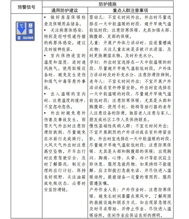 五、分级防护措施指南 针对寒潮预警信号等级,我们提出分级人群防护措施建议。