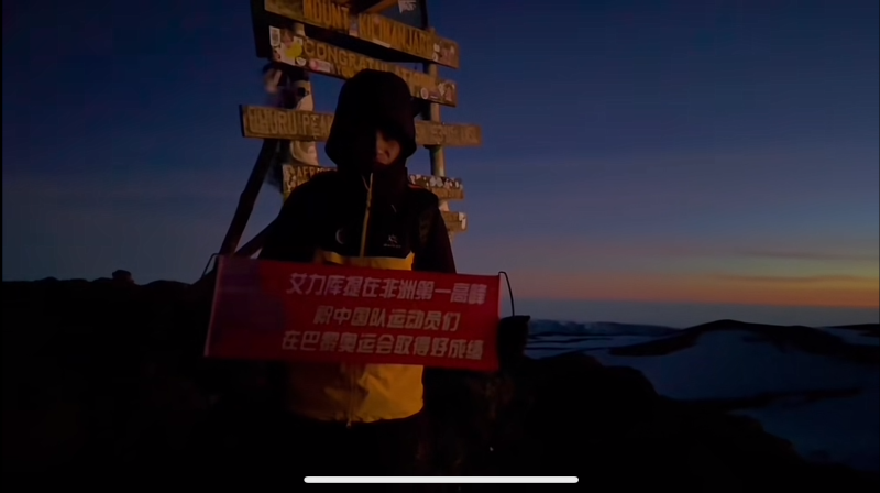 艾力库提·地里夏提登上乞力马扎罗山并祝福中国奥运健儿。图源:艾力库提个人社交平台