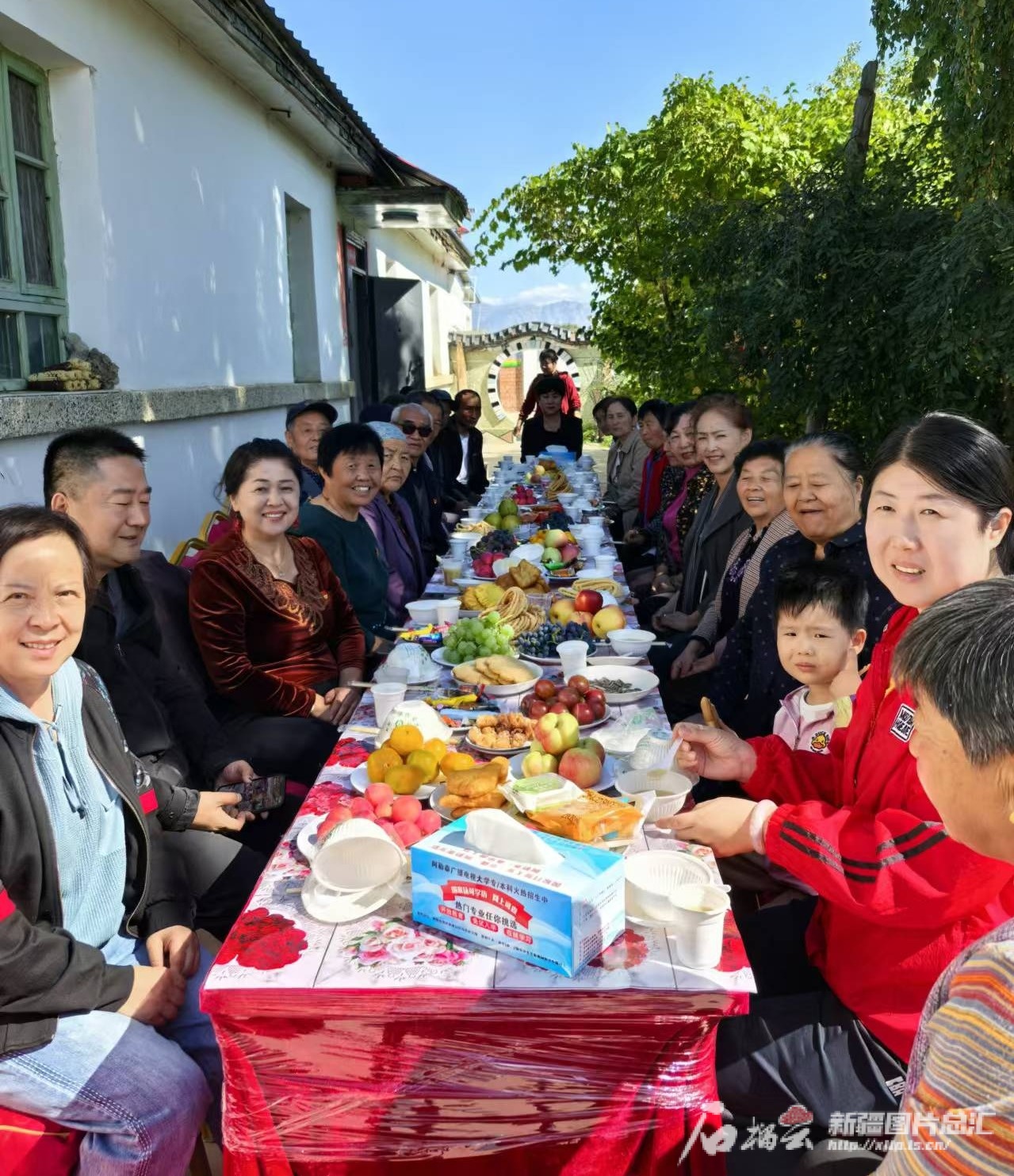 【奋进强国路 阔步新征程】 天山网-新疆日报记者 魏永贵 张婷 9月16日14时,阿勒泰市红墩镇“户儿家”文化大院里,传来阵阵欢声笑语。 葡萄架旁,白桦树下,长条桌上月饼、馓子、奶疙瘩、果酱、葡萄、苹果摆得满满当当,奶茶的醇香扑鼻而来。红墩镇30多位居民坐在桌前,谈笑风生。大院女主人李红秀跑前跑后忙个不停。