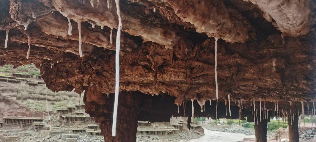 西藏芒康县纳西民族乡的盐棚下,梁上垂下盐柱。新华社记者侯韶婧 摄