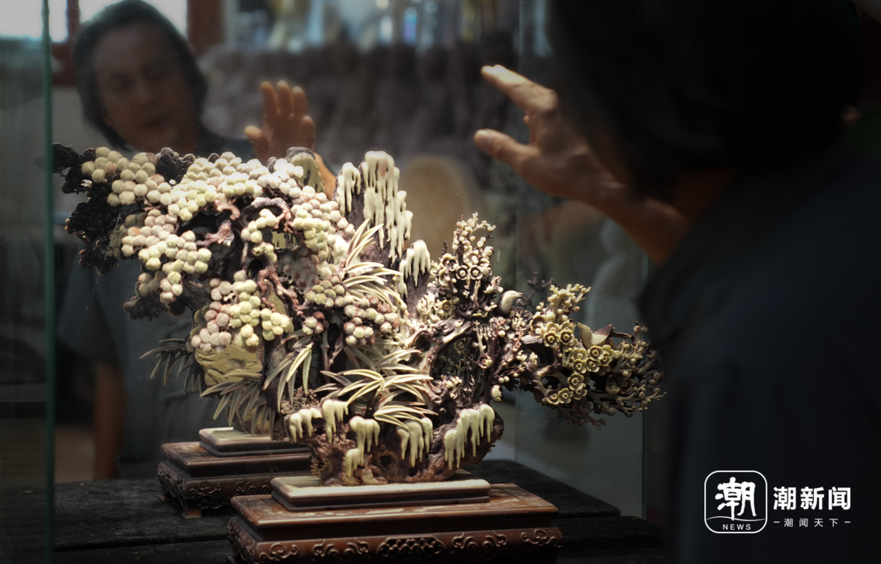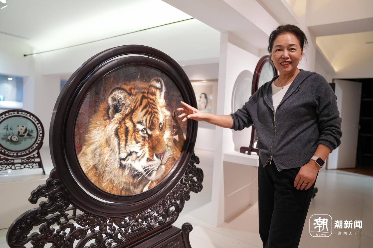 刘能风的作品“岁寒三友”博采众长,兼收并蓄。记者 彭鹏 摄 以往,大足石刻更注重造型。但刘能风对青田石雕“因势造型、依色取巧”的技艺产生了兴趣。最终,他选择了来自贵州梵净山的紫袍玉为原料雕刻“岁寒三友”。 “这件作品中,我除了采用圆雕、浮雕和线刻技术,还借鉴了东阳木雕镂空雕的技术。”刘能风介绍。 “一门手艺要想活下来,后人要博采众长、有所创新,才能生生不息。”刘能风的话语间,透着浓厚的重庆味。开山化石,本就是重庆人的精神和态度;兼容并蓄,更是刘能风在传承之路上悟出的道理。 戏曲、音乐、美食、服饰、节庆、民俗、手工技艺……浓缩体现了长江沿岸百姓类型丰富、活态存在于当下的生活方式和地域文化,中华民族的精神理想、生活情感、伦理道德、气质节操,全然蕴含其中。 正如历史学家冯天瑜在《长江文明》一书中所言:“长江流域多元共生、和而不同的文化特征,正是中华文明博大包容力的写照,也是中华文化面对全球化挑战的策略抉择,不同文化之间的相互交流、整合、吸纳,不断为中华文化的发展注入新的活力。” 迭变:为有源头活水来 岳麓山脚下,在国家级非物质文化遗产湘绣代表性传承人李艳的工作室,一场母女间的“碰撞”通过绣品悄然展开。 馆内一侧,珍藏着融合李艳创新针法的双面绣座屏《山兽之君》,同款曾以220万元高价拍出,成为刺绣作品国际市场的价值标杆;而另一侧,在李艳女儿昌妮主理下,湘绣不再是高不可攀的鸿篇巨制,转而翩然游动于腰扇、香薰盒,乃至冰箱贴、车挂之上。 30余年前,学油画的李艳打破常规,把绘画语言巧妙地融入刺绣中,并自创了汗毛针、绒毛针、卷毛针、毛针四种新针法,终成一代湘绣大师。