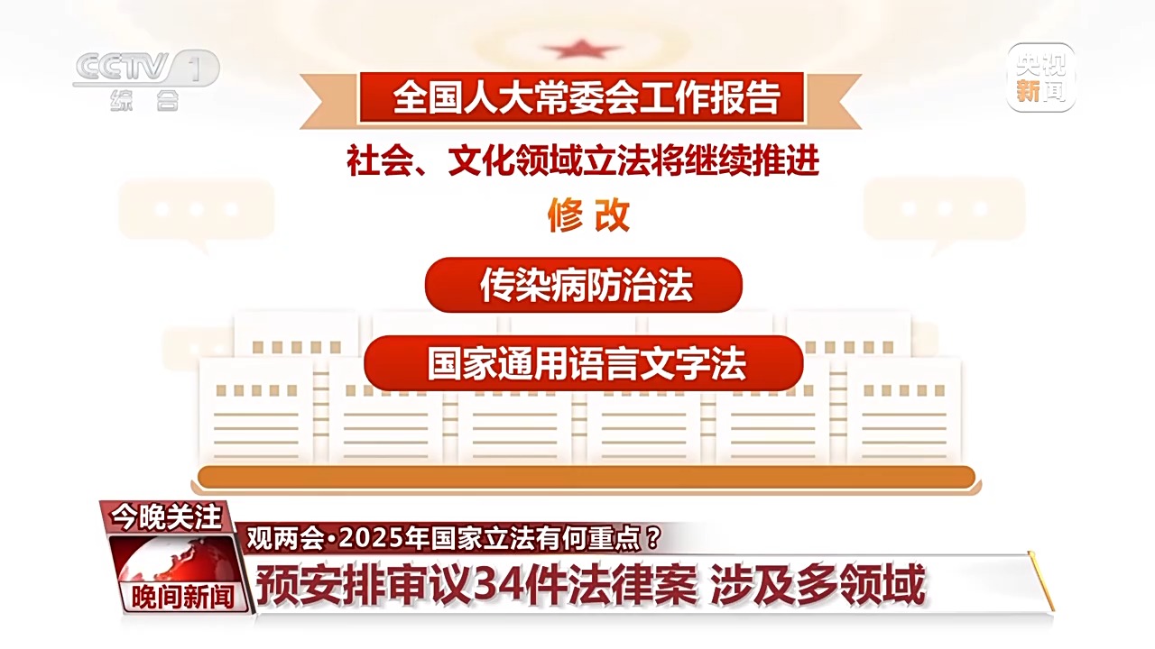 社会、文化领域立法将继续推进,2025年将制定法治宣传教育法、社会救助法、托育服务法检察公益诉讼法,修改传染病防治法和国家通用语言文字法。