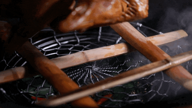 浅咬一口是松烟的辛香 再品一口是红曲的醇厚 细细咂嘴 茶叶的清香交织着辣椒的劲爆 当地人说 吃的就是“山场气” 武夷熏鹅佐着大红袍茶汤 岩谷生春,烟熏回韵 最是那不能忘却的“乡愁”