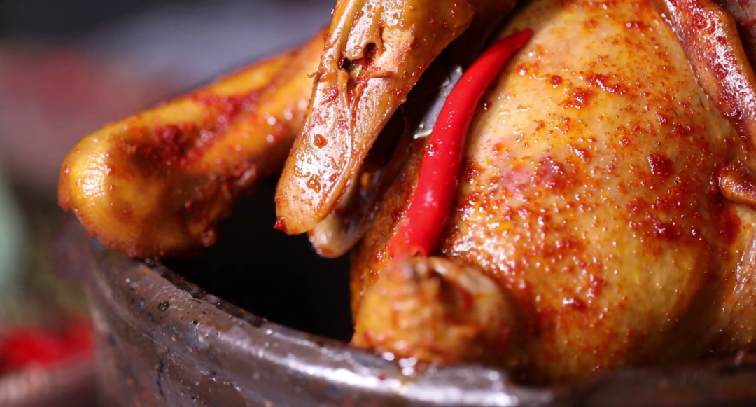 不肥不瘦的成鹅洗净后 卤煮至七八分熟 捞起后沥干水分做“SPA” 涂上辣椒粉、茶叶、桂叶 盐巴、生姜、大蒜等佐料 再用竹篾撑住鹅 放入锅里