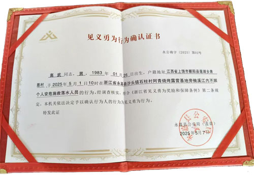 5月1日上午,在浙江省温州市永嘉县楠溪江阿青烧烤露营地,游客任女士发现儿子不慎落水后大声呼救。同行的高武闻讯立即跳入江中施救。孩子成功获救,高武却不幸身亡。5月7日,记者获悉,高武勇救落水儿童的行为,已被永嘉县公安局确认为见义勇为。