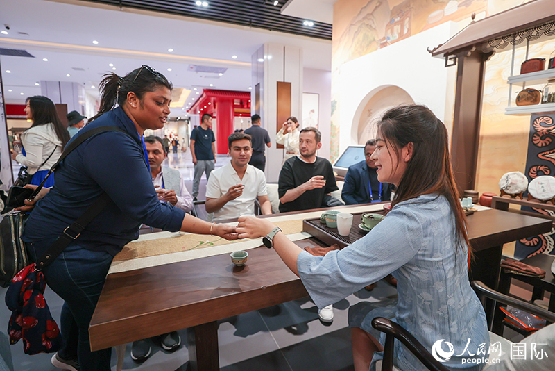 5月25日,外国媒体人在霍尔果斯国际边境合作中心中国文化馆参观。人民网记者 张武军摄