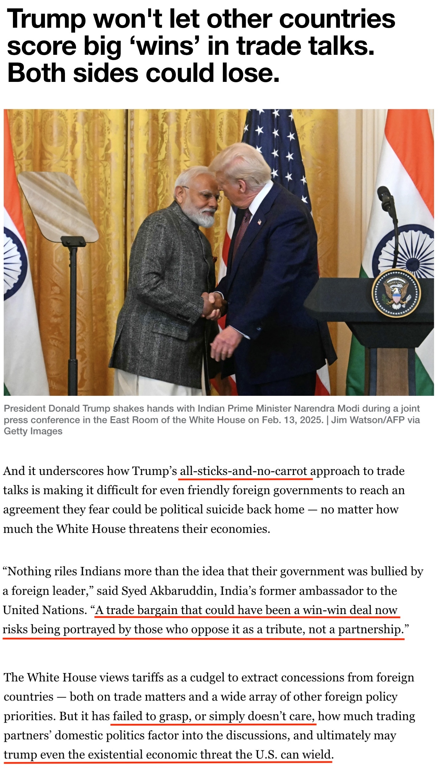 △《政治报·欧洲版》网站报道截图 《政治报》刊文指出,特朗普在贸易谈判中“只有大棒、没有胡萝卜”的策略让即使是友好的外国政府也难以达成协议。 以印度为例,它是最早一批与美国展开贸易谈判的国家之一,与印度达成贸易协议本应是特朗普总统4月初向数十个贸易伙伴发起“对等关税”攻势后取得的首批成果之一,但是由于特朗普政府要求在印度降低贸易壁垒的同时美国只放弃部分新征关税作为回报,所以正式签署协议仍困难重重。 印度前常驻联合国代表阿克巴鲁丁直言:“没有什么比政府被外国领导人霸凌的说法更能激怒印度人的。本来是双赢的贸易协议现在有可能被反对者描绘成‘进贡’,而非伙伴关系。” 文章指出,美国没有理解或者根本不在乎贸易伙伴的国内政治会在多大程度上会影响谈判,而这些政治因素最终可能压倒美国所能施加的经济威胁。 正如文章标题所说,特朗普不让其他国家在贸易谈判中“取得胜利”的做法可能导致双方皆输。