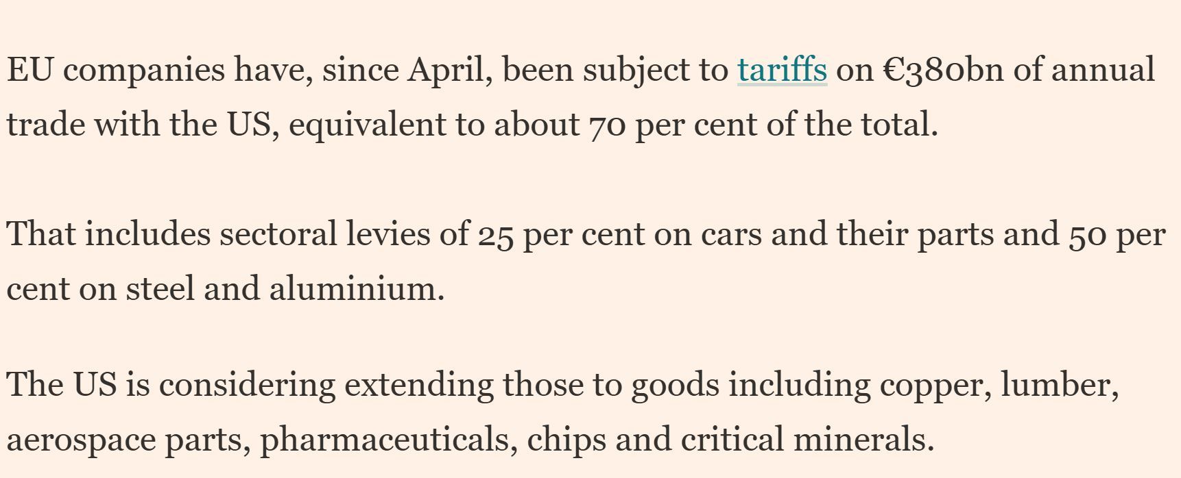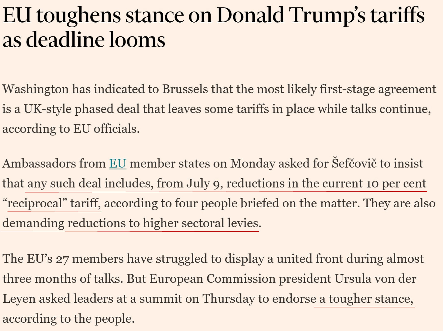 △英国《金融时报》报道截图 从美国的所作所为来看,泰德·墨菲的说法并不夸张。 虽然欧盟一直表示希望通过谈判与美国达成一份“双赢”的贸易协议,但在谈判过程中,美国政府却“幺蛾子”不断: 5月23日“对等关税”缓征期刚刚过半,特朗普突然以欧盟在贸易问题上“很难打交道”为由,威胁从6月1日起对欧盟商品征收高达50%的统一关税。 但仅过了不到两天,特朗普又改口,以“再给欧盟一些谈判机会”为由将此计划推迟到7月9日“对等关税”缓征期结束当天。 据欧方说,美国已向欧盟表示,最有可能达成的是类似美英达成的分阶段贸易协议,在谈判继续进行期间保留一些关税。 随着7月9日最后期限临近,欧盟成员国政府对美谈判立场趋于强硬,已要求赴美的谢夫乔维奇采取更强硬立场,主张任何协议都必须包括从7月9日起降低目前美国对大部分欧盟出口商品征收的10%基准关税,同时要求降低较高的(钢铝、汽车等)行业关税。