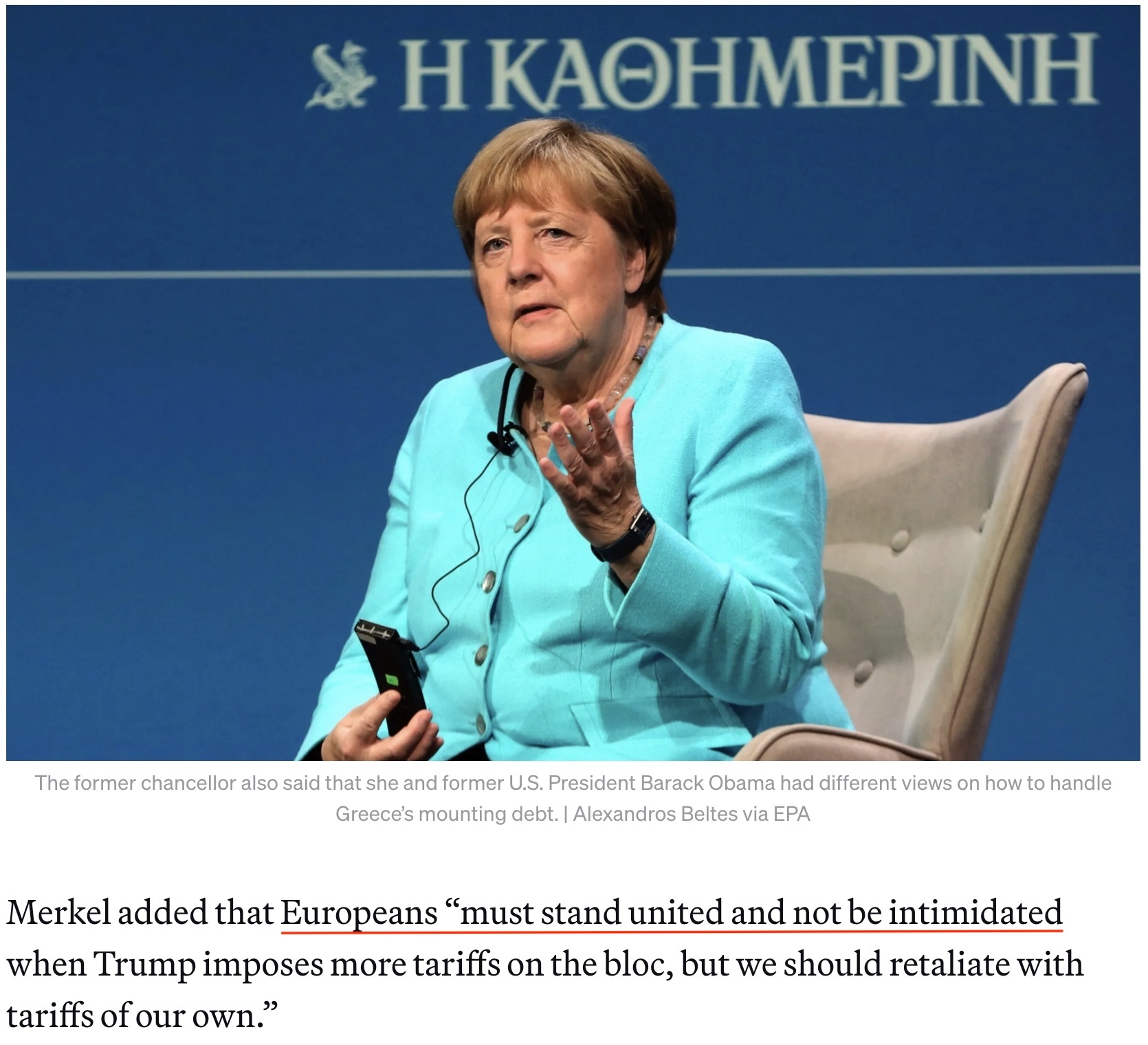△欧洲新闻网报道截图 德国前总理默克尔2日在希腊雅典出席活动时强调,欧盟必须与美国通过谈判解决关税问题,为此欧盟必须团结一致,不应惧怕美国政府的关税,而应以自己的关税进行反击。