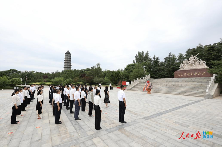 7月15日,参赛选手前往渤海革命老区纪念园向人民英雄敬献花篮。(海外网 谢明 摄)